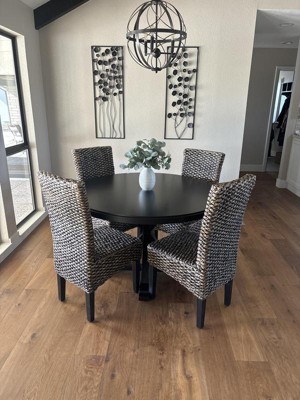 A round table encourages conversation and laughter. The generous size of our Winslet X Base Table means everyone can join in. Featuring a 48 inch round wood table top a-top an X base pedestal. The Pedestal-style base of the table allows you accommodate quite a few chairs at the table so everyone can have a seat. The cross beam designed pedestal makes a striking style statement in your dining room.