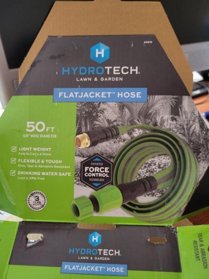 Experience the ultimate in gardening convenience with the HydroTech FlatJacket™ Hose. This 50-foot hose with a 5/8" inner core is lightweight and flexible, making it easy to carry and store. No more dealing with a tangled mess before and after you work! Crafted from durable materials that protect against mold and mildew, this hose resists tears and abrasions due to its unique design. Enjoy reliable performance and optimal water flow thanks to Patented Force-Control Technology that protects from bursting and breaking. HydroTech hoses come in a variety of styles and lengths to fit any size garden, lawn, boat, or car. Water anything, anywhere with HydroTech.
