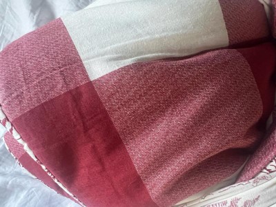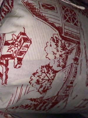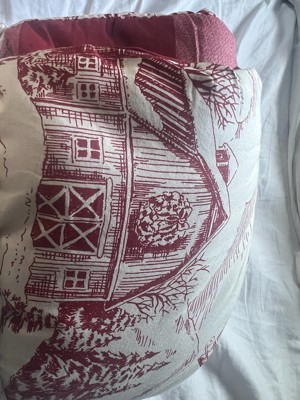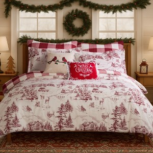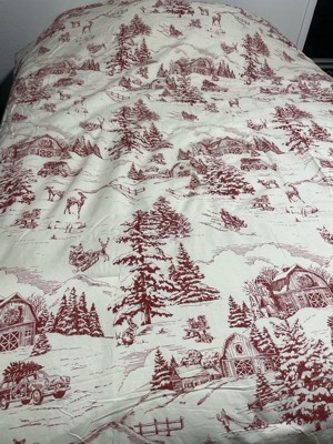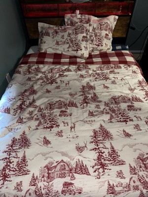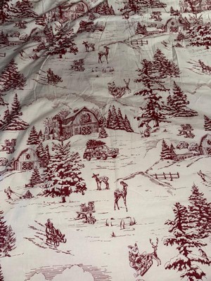 - THE WINTER SLEIGH RIDE DESIGN: Celebrate the season with charming red toile prints of cabins, sleighs, and woodland scenes on a cream background. The reverse side features a coordinating red and cream buffalo check for two classic holiday looks in one set.