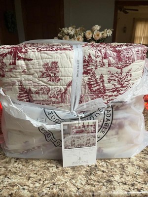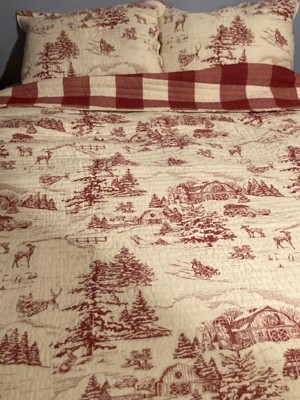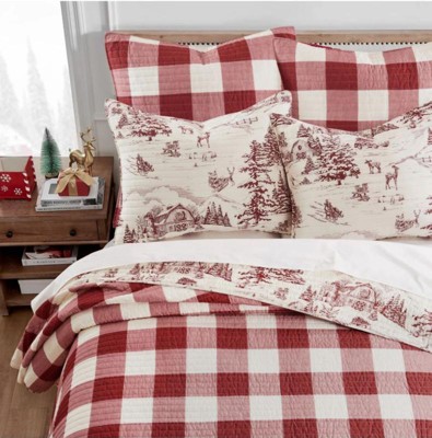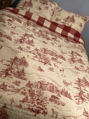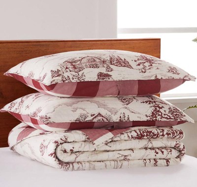 [This review was collected as part of a promotion.] Winter Sleigh Ride Reversible Quilt Set by Levtex Home, inspired by the joy and fun of the Christmas holidays beautifully quilted in classic red and cream, this design will immediately transform your bedroom into a cozy holiday retreat. This quilt is reversible and features a vintage winter village scene on the front, reversing to a red and cream buffalo plaid on the back. Made from the softest cotton and filled with a cotton-rich filler (that includes cotton, polyester, and other fibers), this quilt will never feel heavy or stiff.