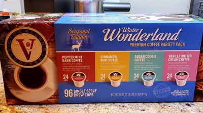 Victor Allen's Coffee, Winter Wonderland Variety Pack features winter inspired flavors that will take are sure to capture the essence of your holiday season and beyond! Stay warm with delicious traditional seasonal flavored medium roasts. Peppermint Bark (a festive blend of refreshing peppermint swirled with white chocolate notes). Cinnamon Bun (ground cinnamon sticks, subtle hazelnut and sweet creamy vanilla). Sugar Cookie (scrumptious fresh baked cookies). Vanilla Butter Cream (indulgent butter cream with smooth and sweet vanilla notes).