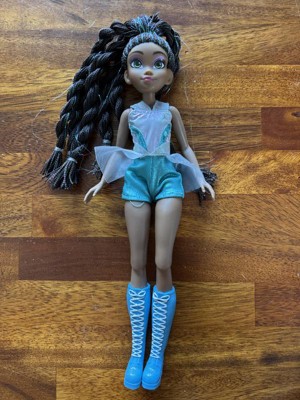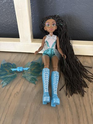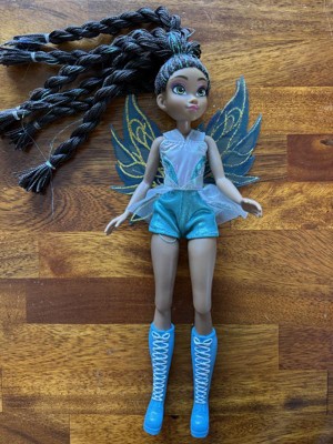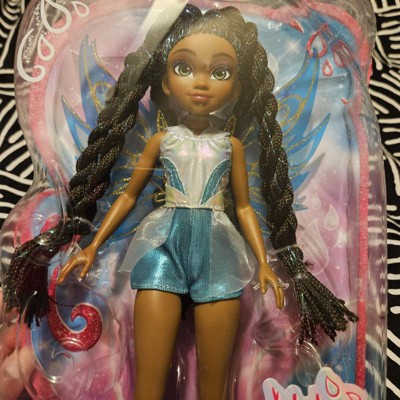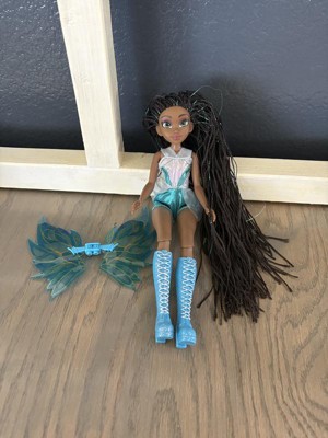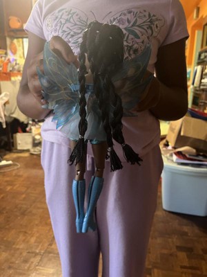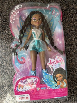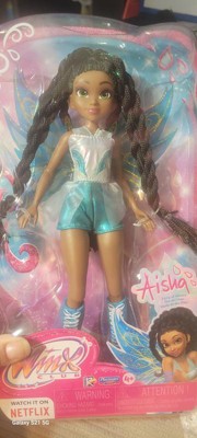 This doll looks like Aisha from the Winx Saga show, with pretty wings and shiny, braided hair; my daughter liked how it matched the character but wished the legs and arms bent more and the shoes came off, though she thought the hair and outfit were very nice.