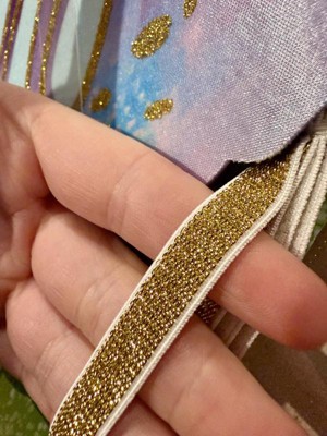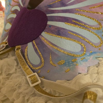 Far more substantial than the costume wings we have bought for our daughter in the past. These will last and she can use them for dress up and ren faires. Rather than being held on with a thin strip of cheap black elastic, these have a thick adjustable band of white elastic trimmed in gold sparkle. The wings themselves are solid instead of sheer. The material is a shiny satin like material with glitter accents. The straps are attached to felt that also holds the wings together. They are child sized, I wouldn’t recommend them for a teen or an adult unless you want bitty wings with your cosplay, but that could be cute too.
