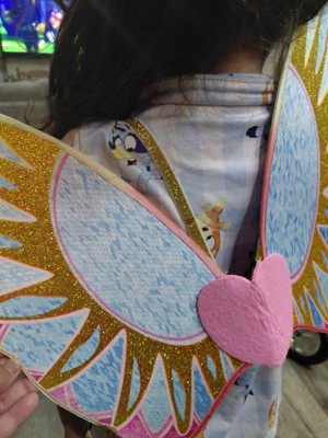 These are a simple pair of wings that are easy to store ( they fold up flat), and fit just about any kiddo. They aren't anything fancy, it's just a print, but my kids are so hard on things they've held up ok.