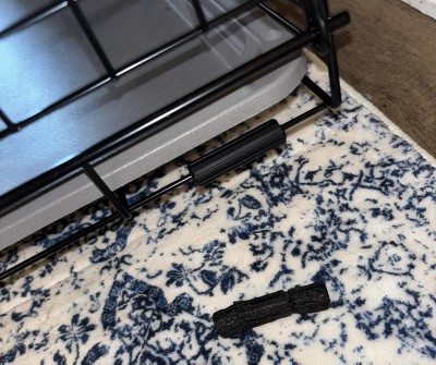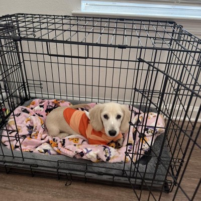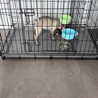 - Black fence-style dog crate is great for home or travel