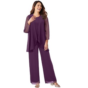 Feel elegant in our beautiful 3-Piece Cascade Pant Set. A flowing open-front cascade jacket that lays to your body creating a graceful silhouette. A 2-tier lined Georgette tank that layers underneath. Comfortable yet stylish pull-on pant with an all around elastic-waist..