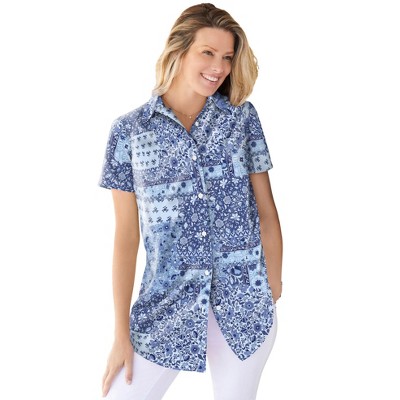 Woman Within Perfect Long Sleeve Shirt - 4X, French Blue Patched Paisley