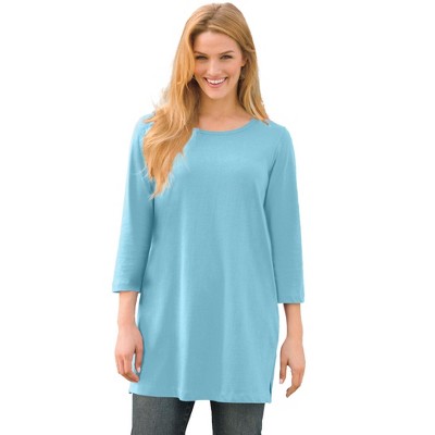 Woman Within Perfect Three-Quarter Sleeve Crewneck Tunic - 30/32, Azure Blue