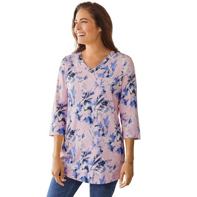Woman Within Rayon 7-Day Three-Quarter Sleeve Tab-Front Tunic - S, White Misty Floral