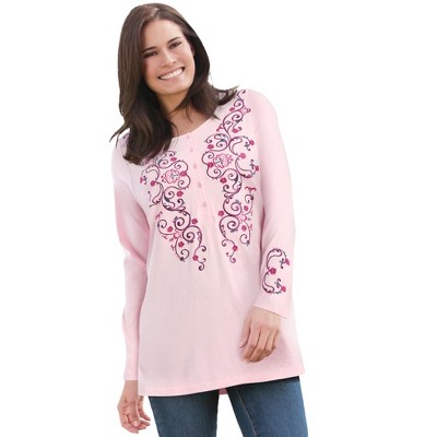 Woman Within 2-Piece Embroidered Poplin Tunic And Tee Set - L, Pink Heart Floral