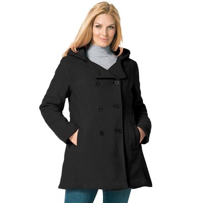 Woman Within Double-Breasted Hooded Fleece Peacoat - 38 W, Black