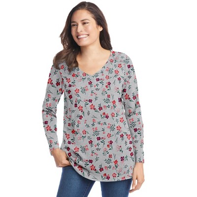Woman Within Perfect Printed Long-Sleeve Crewneck Tee - 2X, Heather Grey Red Pretty Floral