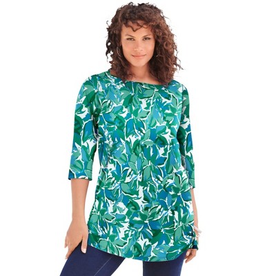 Woman Within Perfect Printed Long-Sleeve V-Neck Tee - 42/44, Emerald Green Field Floral