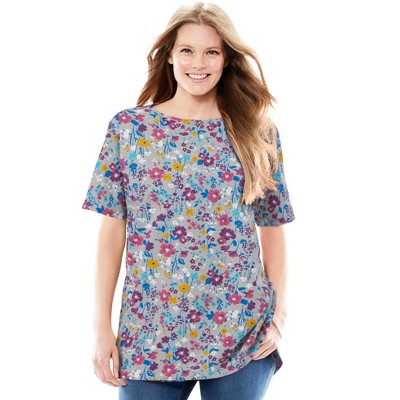 Woman Within Perfect Printed Short-Sleeve Shirred V-Neck Tunic - 1X, Heather Grey Field Floral