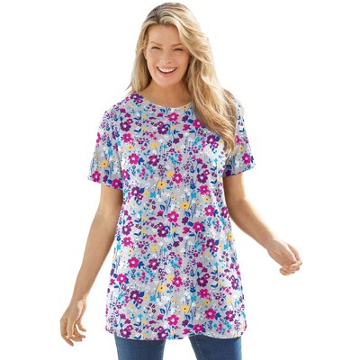 Woman Within Perfect Printed Three-Quarter Sleeve Crewneck Tunic - 3X, Heather Grey Field Floral