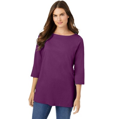 Woman Within Perfect Three-Quarter Sleeve V-Neck Tunic - L, Plum Purple