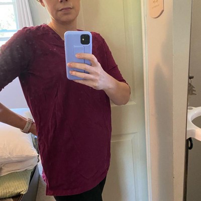 [This review was collected as part of a promotion.] This shirt is very soft and a nice shade of maroon. I like the three quarter length sleeves and the v neck width and deapth. I don’t find it to be very flattering for my postpartum figure. I was hoping it would be loose enough to hide my midsection but it seems to accentuate it instead. I am about 160 pounds and five six and ordered the small. I usually wear a medium or large top in other sizes but ordered the small based on the size chart. It still seems a little oversized in places so it doesn’t seem to be the correct style or cut for me. I received an incentive to write this review.