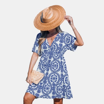 Elegant pintucked design in front and back for a flattering silhouette Sweeping flared skirt adds a touch of grace and movement Faux button-front detail for a polished look Available in stunning prints for a vibrant and cheerful wardrobe Ultimate comfort with a soft poly/rayon knit fabric Perfect for layering with a cute cardigan for versatile styling Average length: 52", Petite length: 48" Conveniently machine washable for easy care Imported.