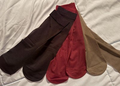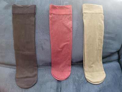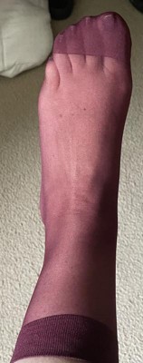 3 pack of sheer hosiery mid leg length. They are labeled as anklet socks. They are more of a panty hose sheer material. There seems to be a reinforced toe and enough elastic at the top that they won’t fall down. I found them to be higher than what I consider ankle length. Included in the 3 pack were black, dark grey and a wine (burgundy) color.