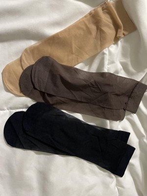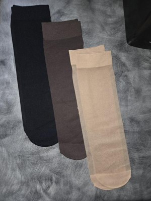 The women's New Day sheer ankle socks come in a 3-pack. The colors are black, beige, and soft brown. It is one size fits all. I like how the toe area is a little darker and not as sheer. They were comfortable to wear; I was actually shocked. The top band wasn't too tight at all. These are perfect to wear with certain shoes. The sheer look was perfect. I definitely recommend these sheer socks.
