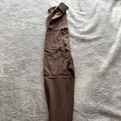 I sized up in these in hopes of the length being long enough but unfortunately these just aren’t made for tall girls. I couldn’t even get these pulled up lol I’m 5’10.5” for reference. If you’re way shorter, these will be great! The color is a nice brown and these aren’t itchy uncomfortable!