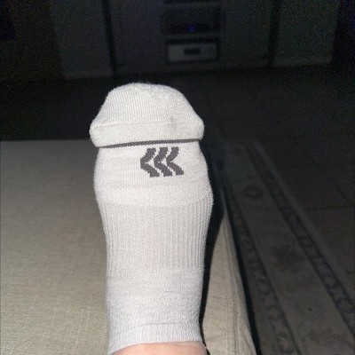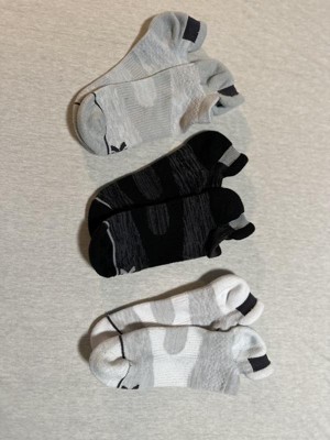 Six-pair pack of athletic socks made from a moisture-wicking, midweight recycled polyester blend with spandex and ventilating mesh. Arch support as well as zone cushioning on areas of the feet that need it most and a reinforced heel and toe round out the comfortable fit. Plus, the neutral black, gray and white colors with patterned textures and logo designs add a touch of style to your feet, while the no-show height with the back tab makes them easy to wear with a variety of shoes.