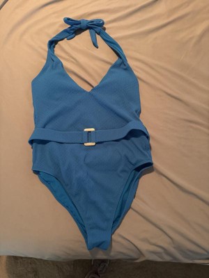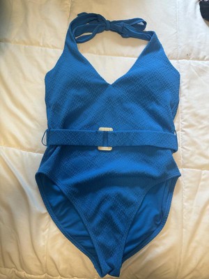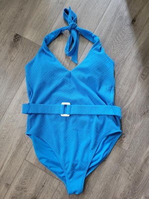Shade & Shore™ Women's Ottoman Ribbed Plunge High Leg Medium Coverage One Piece Swimsuit in size medium features an abstract print ottoman ribbed pattern for a textured look. It also has a belt decoration built in to the waist of the suit. It's made with recycled polyester-spandex fabric with elastic at the leg openings and four-way stretch to give flexibility and comfort in and out of the water. It features a halter-neck design with removable padding for customizable coverage. However this suit did not provide enough support for me in the bust so it was not super flattering in the chest area.