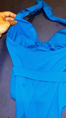 I love the color and the style of this swimsuit, but the belt isn't adjustable and ended up drooping down. The halter top tie helps the top half fit really well, combined with the subtle texture throughout the swimsuit. The bottom front felt like it was a little bigger and saggier than usual. I like the top half of this suit, but the bottom half including the belt just didn't fit right on me.