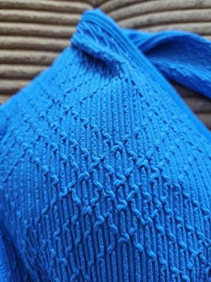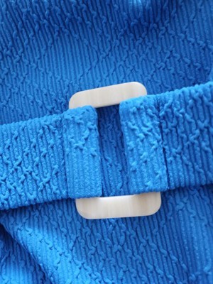 This is a very flattering and stylish swimsuit for the summer. Love the belt detail and the ribbed fabric. It provides just the right coverage and not too revealing, yet still makes you feel sexy. The swimsuit looks expensive and I love the bright blue color, it’s absolutely perfect!