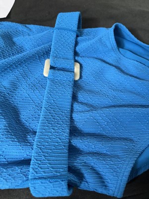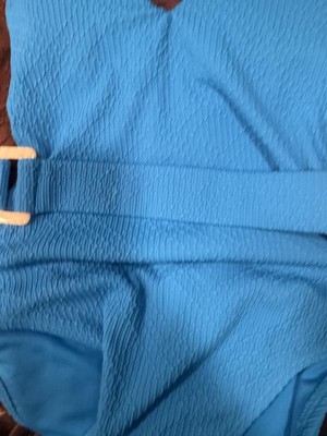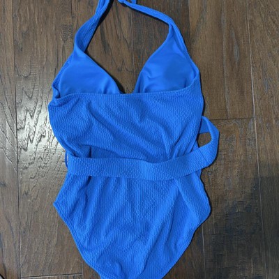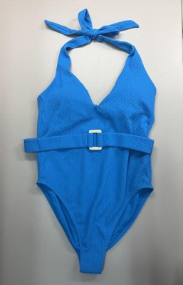 Gorgeous summertime blue one piece bathing suit. It fits like a glove and the belt accent pulls the eye where I want it go so I feel comfortable. It stays in place and doesn’t ride up in awkward places .