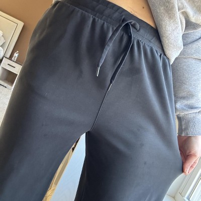 Nice "upgraded" sweatpants. They have a flattering fit at the waist and through the hips. The material hangs nicely. Only downside for me is the length. At 5'3" these are too long even with platform tennis shoes.