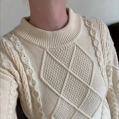 [This review was collected as part of a promotion.] I purchased this cozy alpine cable knit crewneck pullover sweater in a size small & it fit perfectly! I am 5’5”, bra size 34B, & usually wear a size small in sweaters. Love the mountain inspired vibes, jacquard-knit texture, comfortable midweight feel & dropped shoulder style. This would look great with jeans or dress pants or skirt. Overall, I love the quality & style & would recommend adding this to your winter wardrobe.