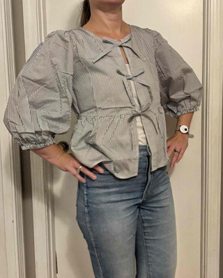 I bought the black and white stripe and white color way in my regular size small. Very cute with just the right amount of a peplum feel and balloon sleeves. The ties are so cute, but you definitely would have to wear something under it. I can’t wait to wear this with skinny ankle pants for work or wide leg jeans!