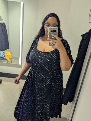 I found this dress to be extremely flattering. Love the lenght and sleeves! Its a light material so not too hot. The pleading is very cute and flattering on the waist.