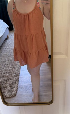 Super gorgeous tiered sun dress in soft muslin material is a must for this coming Summer! The color is a pretty terra cotta, more of a muted soft orange. The braided strap adds a nice little stylish touch. They are also adjustable around the shoulder depending on how relaxed you want it to be. It is a shorter cover up so it’s not something you want to wear just anywhere! I was surprised how short it is but the picture with the model is accurate. The small is more oversized which is not a problem, it will be more flowy over my suit!