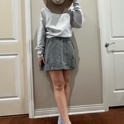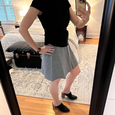 [This review was collected as part of a promotion.] I purchased this women's skirt online. This gray felt skirt looks great for either work, or for hanging out on the town. It cam be dressed up or down. It looks great with a pair of tall boots, heels, or even sneaker. It has a pull on waist so it's easy to wear and style. I'm wearing a size small and I would say that it runs true to size. I typically wear a size 2-4 in bottoms. The price was fairly reasonable and i think i will get quite a bit of wear out of this because of its versatility.