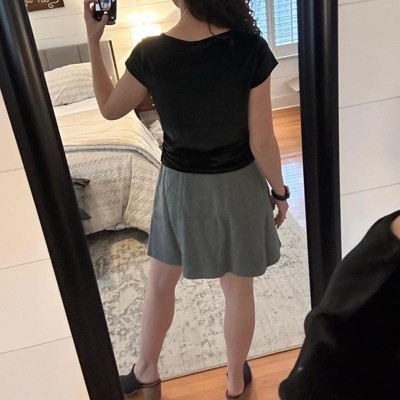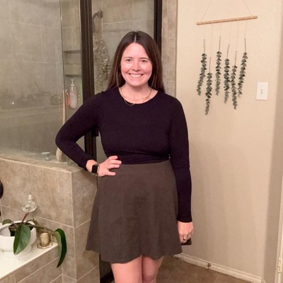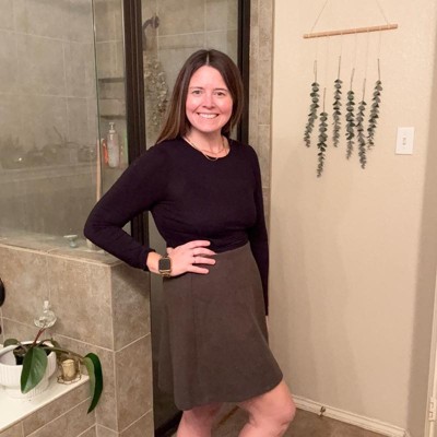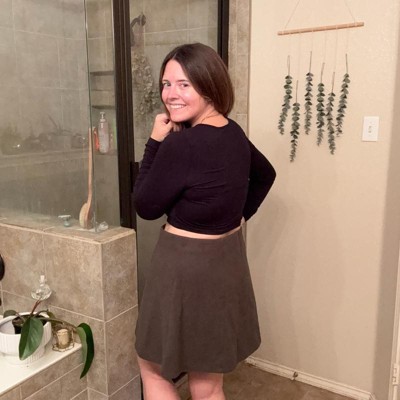 [This review was collected as part of a promotion.] This is an adorable and super versatile women’s brushed mini skirt from A New Day. I absolutely love this army green color, it’s really easy to find matching tops for. I love the length as well, not too long or short. The fit of this skirt is perfect and I’m wearing my usual size large. My measurements are 33 inch waist and 41 inch hips.