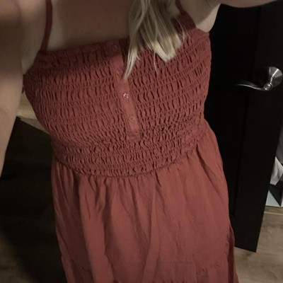 This Button-Front Smocked Maxi Sundress from Universal Thread™ adds an easy-breezy piece to your wardrobe. Made from a lightweight fabric blend of rayon and nylon, this pullover sundress boasts a smocked bodice that flares into a soft-gathered, tiered maxi-length skirt with functional side pockets. Tailored in a sleeveless silhouette, this solid-color dress has a stylish square neck with a button-front design and adjustable straps that allow you to customize your fit. Complete your ensemble with a straw hat, scarf and sneakers for a picnic or opt for shades, sandals and simple accessories for a brunch party.