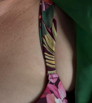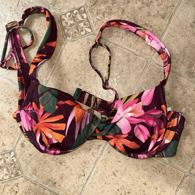 This top is great! I love the colorful print, the supportive feel of the underwire and the wider comfortable straps! I generally am not a fan of the look of an underwire bathing suit but the twist front helps conceal that a bit. Love the gold fasten for the back. I feel very comfortable and supported in this! Fits true to size!