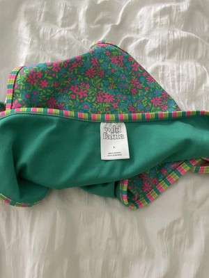 Vibrant beautiful colors! This bathing suit is gorgeous . The outside is a fun floral and all the edges are lined with stripes of the same colors. The inside is a solid green. Tie stings on the sides so it’s adjustable