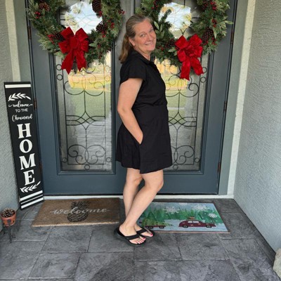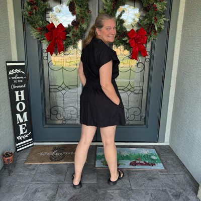 [This review was collected as part of a promotion.] This black dress is cute and a good one to add to the wardrobe. It can be dressed up or down depending on the occasion. Great for business attire. The material is a little stiff so feels slightly heavy on and will need to be steamed or ironed before wear. The overall length is good and love the pockets. I am wearing a size large and it fits as expected. I am five foot seven inches tall with a 36B bra, 44” hips, and 41” waist.