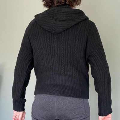 [This review was collected as part of a promotion.] I purchased this women's sweater online. This black zip up hoodie is a great alternative to wearing a sweatshirt when you need to bundle up on a cold day. It's a little more stylish than your typical hoodie. The knit is soft and not itchy at all. It can be worn zipped up or worn open. It fits true to size. I'm wearing a size small which is my usual size. I am 5'4" and wear a 34B for reference. The price was reasonable and I think it is well made.