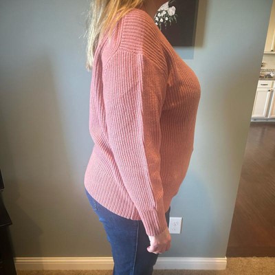 Great sweater for the colder weather and the mauve/pink color is beautiful. On me it’s loose and baggy. If you want a more fitted look I would suggest going down a size.