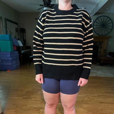 [This review was collected as part of a promotion.] I am wearing a size XXl in this crewneck stripped sweater by Ava and Viv. I am a normal size 10/12 but liked how this fit and was a little oversized on me but not bad. I loved the tan stripes against the navy blue sweater. The material was soft and the stitching quality was great. The cuds around my neck and wrist are a solid blue and thicker material. Great quality sweater. I received an incentive to write this review.