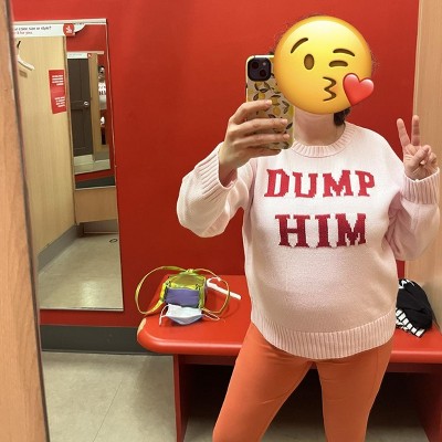 Seems like a lot of people in the reviews need the "Emotionally Unavailable" sweater... "Dump Him" is not a offensive. Relax. It's also made for the teenage line of clothing so adults, stop being weird about it. If you don't want to look at it, close your browser.