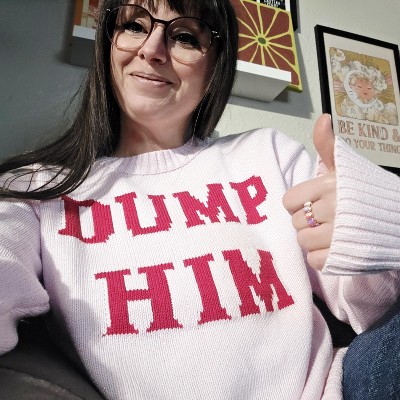 Convinced the one star reviews left by “Susan” and all the rest are just butt-hurt men using fake names. Men are afraid that women will laugh at them. Women are afraid that men will kill them. Anyway on to the actual review! I love this sweater and can’t wait to wear it absolutely everywhere. It is soft and cozy and a great eye-catching and funny design. I’m only 5’3” but I got an extra large because I really like my sweaters to be oversized. The cut of it is a little more close fitting to begin with so you might want to size up if you enjoy a similar oversized vibe. Also, it is 60% cotton so I’m sure it’s going to shrink some after the first wash.