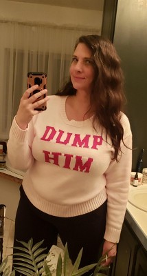 Can’t wait I just ordered it! I love this sweater I tried it on in the fitting room and just ordered the emotionally unavailable and this pink one dump him and feel it’s fitting and perfect for me. As I’m going through a break up right now it’s super fitting and my family and friends can cheer me on how that was such a bad relationship. Thank you target!!! It’s refreshing to see sweaters with the truth on them sometimes we need to see the quotes the hard real truth on a sweater for you serious woman and men don’t worry about it this isn’t your cup of tea. You also have to have a good outlook on life and such these sweaters are only for the strong minded individuals that can take a joke.
