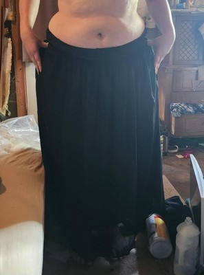 [This review was collected as part of a promotion.] This maxi skirt in size 4 fits true to size. I went with my waist size which is a size down from hip size on the size guide but thought since it was a flowy skirt, I’d get away with it…and I did. The skirt without heels hit almost exactly to the floor so I found myself stepping all over it as I bent down to pick things up. Pairing with high heels remedies that though. The mesh layer over the opaque satin was a nice design touch. I liked the upper portion that was like a large waistband that gave it a control top feel and shaped your waist. My burgundy red Vneck fitted top tucked in made a nice pairing with the flowy bottom. For reference I’m 5’4” and measure at 32-28-38. I received an incentive to write this review.