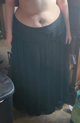 [This review was collected as part of a promotion.] This future collective long black skirt is cute. I ordered a size 20 and I was able to pull it up without using the hidden side zipper. It seems to run a little bit large. The fabric is made from 90% recycled polyester. I did not like that the top of the skirt fabric runs perpendicular to the fabric on the bottom of the skirt. There is also a small ruffle between the band of the skirt and the main skirt. I would have liked it if it was all just from the bottom of the skirt. I did not like that the band was tighter around my waist. It has a very 90’s era feel. I received an incentive to write this review.