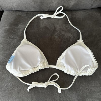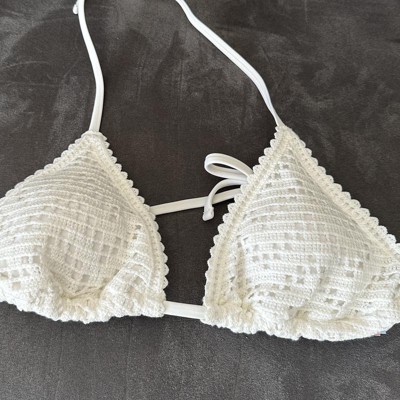 [This review was collected as part of a promotion.] I love this white crocheted triangle bikini top. It is well made, comfortable and easy to tie. You can tie this top in a variety of ways for different styling. It has a beautiful block like pattern to the top. It included removable pads depending on your preference. You can easily mix and match with other bottoms. I got a size large and fits true to size being a size large. I received an incentive to write this review.